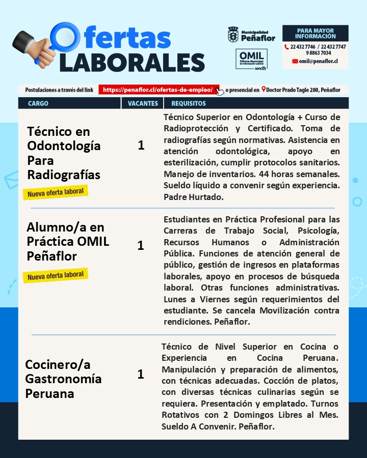 También puedes postular en forma presencial en oficina de OMIL calle Doctor Prado Tagle 280.Recuerda traer tu Currículum Vitae actualizado en formato PDF o Word.