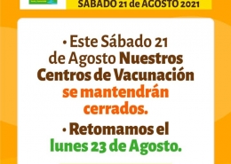 Hoy Sábado 21 de Agosto nuestros Centros de Vacunación Covid-1919 estarán cerrados . El proceso de retomará este…