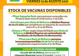 Vacunación Covid-19: Stock de Vacunas Disponibles Viernes 13 de Agosto