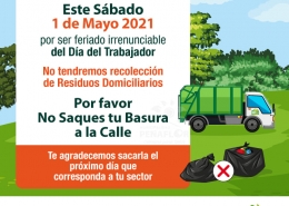 DestacadaEste sábado 1° de Mayo no habrá recolección de residuos domiciliarios por feriado irrenunciable del Día del Trabajador.